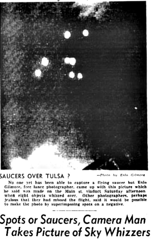 PHOTO ON THE LEFT-- TAKEN-JULY 12, 1947--THE TULSA DAILY WORLD-- NEWSPAPER/ IS THIS PHOTO = FOO FIGHTERS-- FLYING SAUCERS---- A FAKE? I THINK THE PATTERN OF THE FOO-FIGHTERS-UFOS OR SMALL GLOBE LIKE CRAFT RESEMBLES WHAT IS SEEN ON THE 1952 UTAH FILM, THAT CAN BE VIEWED BY CLICKING ON ONE OF THE ABOVE LINKAGES.
