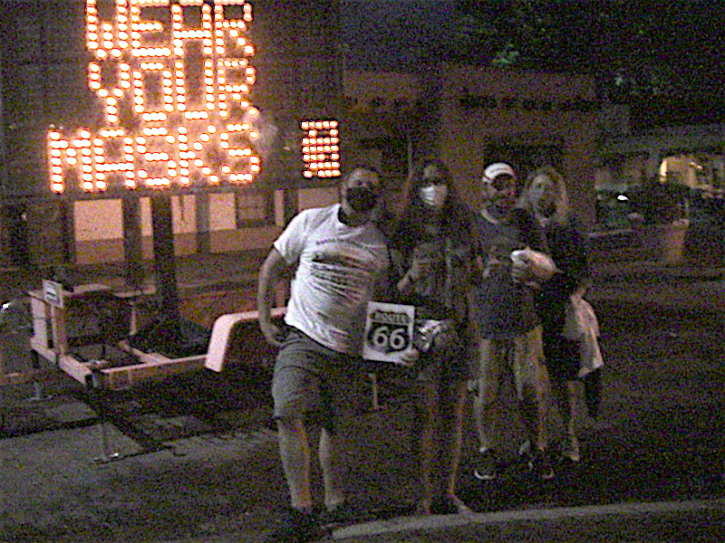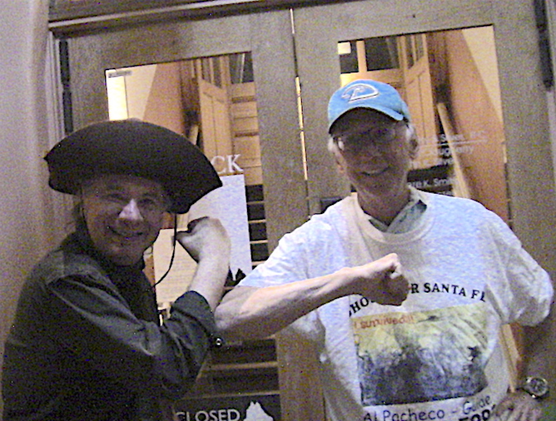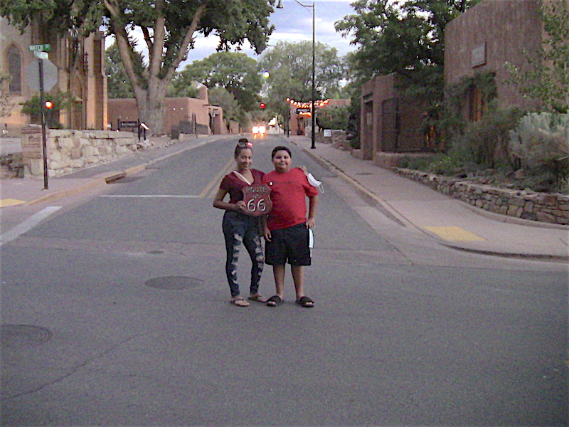 C19-GHOST-TOUR-SANTA-FE --- the most popular tour is the early evening KICKOFF -- you start in the light or late twilight -- -- then end the tour in the dark --- On your safari through SANTA FE --- bring your questions and if you have a shadow chaser gadget -- BRING IT.... C19-GHOST-TOUR -- it seems the spooks are immune to this hysteria. On tour you walk through the ROYAL CITY -- ALLAN PACHECO your guide tries to tack the tour towards your interests -- ghosts -- ufos -- the mission g--- conspiracy etc... Below on tour -- behind these two is OLD ROUTE 66 -- YES_-- RT66 used to pass through SANTA FE -- and the duo are standing on a section of the old MOTHERHOOD == CHICAGO to L.A......... The old ROUTE 66 in Santa Fe was one lane coming and one lane going.