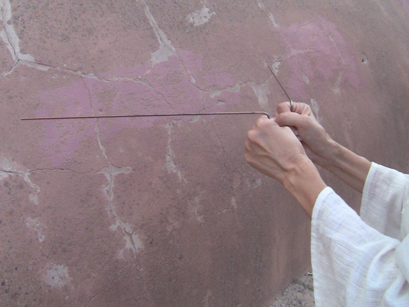 ABOVE; a photo taken of an energy, is it one or a couple of ghosts, there and gone. IT looks to me like a profile of a face in the middle, others claim it is reptile energy face, full front on. Skeptics will say it is a trick of light. This photo was taken near haunted MARIAN HALL. This area on rare occasions is loaded with ghost activity. Below: not an attack by an energy, the ghost hunter picked up something was there. The dowsing rods or ghost rods, registered AN ENERGY. THIS area by the OLDES CHURCH in USA / SAN MIGUEL MISSION at times can be a focal point for ghost powers.