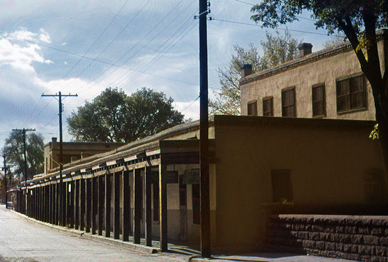 BELOW: An aerial view of where SENA PLAZA as in comparison to THE CATHEDRAL. The ST. FRANCIS BASILICA dominates the phot a few hundred yards to the North of the church, where the WHITE ARROW points, is SENA PLAZA. OR the old SENA MANSION. In the snapshot you can see a little of the large courtyard that is beyond the mansion's front wall, that fronts PALACE AVENUE.