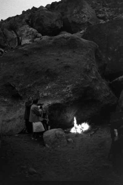 Below: The warmth of the tent. Note where it is. The campers may wake up a hibernating rattle snake! No reports were made of sidewinder bites. Rattlesnakes nest under large rocks.