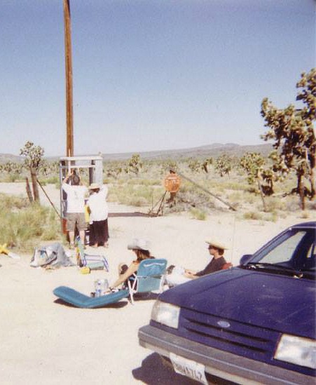 THE VAST MAJORITY OF TIMES, WHEN THE PHONE LINE WAS NOT OPEN, IT WAS BECAUSE THE PHONE WAS IN USE, OR IT WAS BROKEN; AND THEN- FOR SOME ODD OR BAD REASON, A SOLO USER WOULD LEAVE THE PHONE OFF THE HOOK. ONLY WHEN SOMEBODY GOT TO THE BOOTH AND PUT THE PHONE BACK IN PLACE WOULD THE LINE WOULD BE OPEN. NEAR THE END OF THE PHONE BOOTH's EXISTENCE, THE VAST MAJORITY OF TIME WHEN THE LINE WAS NOT OPEN, IT WAS BECAUSE SOMEBODY WAS CALLING IN OR OUT. BY THE MID 1990s THE SECRET WAS OUT! PEOPLE WANTED TO CALL FROM OR TO, THE EDGE OF THE WORLD! IN THE LATE 1990s DUE TO ZINES AND MAIN STREAM MEDIA, WAVES OF PILGRIMS VISITED THE MOJAVE-PHONE-BOOTH. CONSEQUENTLY ON BUSY DAYS, THE CALLERS HAD TO WAIT IN LINE TO USE THE PHONE. WERE THERE FIGHTS TO USE THE TELEPHONE? I DO NOT KNOW OF ANY, I AM SURE SOME PEOPLE GOT GRUMPY. WAITING TO USE A DESERT PHONE AMONGST MAYBE 30 PEOPLE, MOSTLY STRANGERS, COULD BE DIFFICULT. THE |