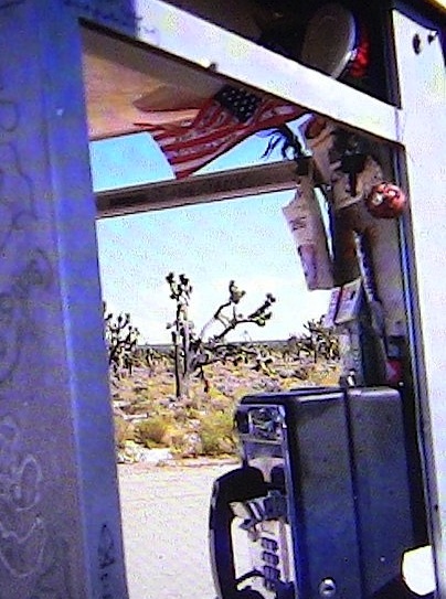 ![]() Yes, those are bullet holes. But by the late 1990s, decals, graffiti and decorations to the MOJAVE-PHONE-BOOTH incorporated the holes into a mosaic of art or I WAS HERE logos... The pilgrims honored the Phone box as a counter culture icon.![]() ![]() |