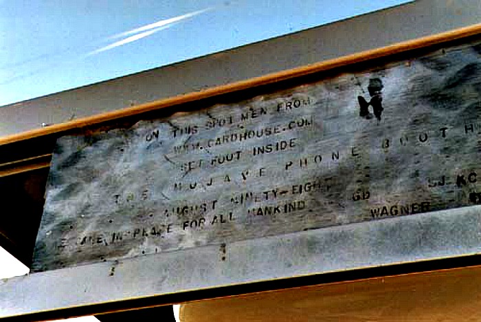 ![]() ![]() ![]() GOT PHOTOS OF THE OLD PHONE BOOTH--SEND THEM -- santafewriter@me.com ![]() ![]() IF YOU GOT TO THE MOJAVE PHONE BOOTH, LEAVE YOUR MARK -- YOU MADE IT THERE, AGAINST GREAT ODDS!![]() NORTH OF THE MOJAVE PHONE BOOTH IS TOP SECRET AREA 51. CLICK ON ICON -- BELOW -- HOAX OR TRUTH? YOU DECIDE? IT SOUNDS CONVINCING TO ME… GREAT ACTOR OR PRANKSTER OR DA TRUTH. MYTH OR PRANK OR LIE = DID THE CALL COME FROM THE MOJAVE-PHONE-BOOTH?![]() BELOW: THE PLAQUE THAT WAS ON SPACE PROBE "PIONEER 10". IN 1972 THE CRAFT WAS LAUNCHED. THE INSCRIPTION SHOWED MALE & FEMALE, THE SPACESHIP & THE MAP OF THE SOLAR SYSTEM. BELOW RIGHT; THIS PLAQUE WAS PLACED AT THE BOTTOM OF THE MOJAVE PHONE BOOTH.![]() ![]() |