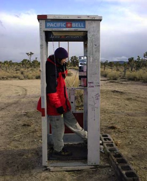 BY THE END OF THE 1990s THE MOJAVE-PHONE-BOOTH WAS GETTING CALLS FROM FROM ALL OVER THE WORLD, BE IT GERMANY, ENGLAND, ALBANIA, CANADA, NEW ZEALAND, AND FRANCE. ONE UNIQUE AMERICAN CALLER WAS AN 84 YEAR OLD WIDOW FROM BOSTON WHO WOULD PHONE THE BOOTH DAILY, AND SPEAK TO WHOEVER WAS THERE OR TO SEE IF ANYBODY WAS THERE. THIS WIDOW WOULD GET A CHARGE FROM THE THRILL OF TALKING TO SOMEBODY IN THE MIDDLE OF NOWHERE, AND THAT IS BASICALLY WHERE THE MOJAVE-PHONE-BOOTH WAS SITUATED, AT THE EDGE OF THE PLANET. I KIND OF THINK THE ENERGY OF THE MOJAVE-PHONE-BOOTH KEPT THE BOSTONIAN WIDOW ALIVE. THE PHONE BOOTH WAS A TONIC IN SO MANY DIFFERENT WAYS FOR THOSE THAT CALLED IN OR ANSWERED THE RING.