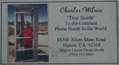 I THOUGHT THE PHONE BOOTH HAD A ODD, STRANGE--BUT GOOD ENERGY. APPARENTLY SO DID OTHER PEOPLE. GODFREY IN MY OPINION WAS A 1990s "CHRISTOPHER COLUMBUS", NOW THAT IS QUITE A CLAIM. BUT THE FACT IS, GODFREY TOLD THE PEOPLE WHO HAD ADVENTURE IN THEIR HEART BY WAY OF THE INTERNET, THAT THERE IS A "COOL" PLACE OUT WEST. GOT GUTS-- GO TO IT, THE MPB. LIKEWISE, COLUMBUS TOLD THE COMMONS IN EUROPE, THERE IS A RUGGED BUT WONDERFUL LAND ACROSS THE BIG WATER. WHAT ARE YOU WAITING FOR? IN THE FUTURE, I AM GOING OT HAVE TO WRITE A FICTIONAL SCREENPLAY ABOUT THE MPB AND THE CHARACTERS THAT VISITED THAT PLACE. ONE GUY, WHO WOULD GIVE TOURS TO THE BOOTH in 1999 WAS 63 YEAR OLD TOW TRUCK DRIVER CHARLIE WILCOX. TOW TRUCK DRIVERS HAVE GOT TO BE TOUGH, THEY WORK IN ALL KINDS OF WEATHER. SO IT WAS APPROPRIATE THAT THE GUIDE TO THIS MAGICAL ISOLTAED WILD PLACE -- WAS A TOW TRUCK DRIVER. KEEP SENDING ME PHOTOS OF YOUR TIME AT THE HAUNTED WITH GOOD ENERGY MOJAVE-PHONE-BOOTH!!!!!! SO I CAN POST THEM. I AM IN THE PROCESS OF TRYING TO FIND SOME OF MY OLD B/W PHOTOS, BUT I THINK THE PHOTOS ARE LOST FOR GOOD. LEFT: THE MOJAVE-PHONE-BOOTH ALWAYS HAD INTERESTING GRAFFITI OR DECALS. ANOTHER TALL TALE HAD ACTOR, "THE KING OF COOL" STEVE McQUEEN IN THE LATE 1960's RIDING HIS MOTORCYCLE IN THE DESERT AND FINDING THE MOJAVE-PHONE-BOOTH. "THE KING OF COOL" WAS AN ADVENTURER. SO, IS THIS YARN LIE OR TRUTH? WORDS OF WISDOM: NOTHING LASTS FOREVER, THINGS CHANGE! LIVE IN THE PRESENT, DO NOT WAIT ANOTHER YEAR OR MONTH TO DO SOMETHING. STOP MISSING OUT ON LIFE OR EXPERIENCES.![]() |