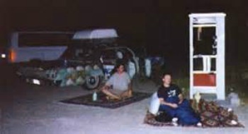 IN THE LAST DECADE OF THE BOOTH's LIFE TIME -- GROUPS OF PEOPLE WOULD FIND THE PLACE AND THEN CAMPOUT AROUND THE STRUCTURE IN SLEEPING BAGS OR BEACH CHAIR RECLINERS. BUT NO BITES FROM SNAKES! SO DO YOU LIKE THIS STORY OF THIS ODD PLACE -- THEN HERE IS ANOTHER COMMERCIAL FOR BOOK THAT CAPTURES -- WHAT MADE THIS PLACE SPECIAL _- ITS BY DOC DANIELS - PRESS ON THE PHOTO OF THE NIGHT CAMP OUT __ AND YOU WILL BE SENT TO AN ORDER PAGE OF HIS FUN BOOK -- ADVENTURES WITH THE MOJAVE PHONE BOOTH -- MORE ON DOC_- THE CHRISTOPHER COLUMBUS OF THE DESERT PHONE IN A BIT.