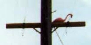 NOTE THE PINK FLAMINGO AT THE PHONE BOOTH---LATER ON SOMEBODY PUT THE PLASTIC BIRD ATOP THE NEAREST POWER POLE. IT IS ALLEGED, IN THE 1970s SOMEBODY LEFT SOME PLASTIC PINK FLAMINGOS AT THE HAUNTED WITH GOOD ENERGY PHONE BOOTH. HOW MANY WERE PLACED THERE IS OPEN TO SPECULATIONS. WHAT BECAME OF THEM-- THE WIND BLEW THE BIRDS AWAY OR THE FOWL WERE TAKEN AS SOUVENIRS? OTHER PINK FLAMINGOS WERE LEFT AT THE PHONE BOOTH IN THE 90s.