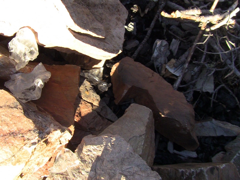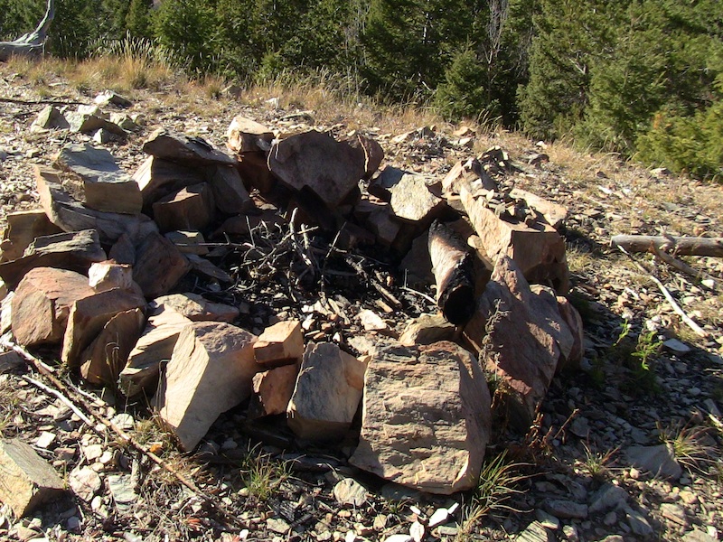 At the end of this road is an abandoned fire tower and Allan + RC found this. These rocks are heavy, somebody did some heavy lifting to build this camp fire pit. In the fire pit was some match covers/ matchbooks from the VIRGIN RIVER CASINO, no idea where that is at or if there is any significance to that name and this place as compared to this place. There was some melted glass, plastic and crystal in and around the firepit. VIRGIN RIVER CASINO, an interesting title for a business --- is there some type of occult link with that name? And with all the strange things that have happened up here... What a place to find --- a book of matches with that name.