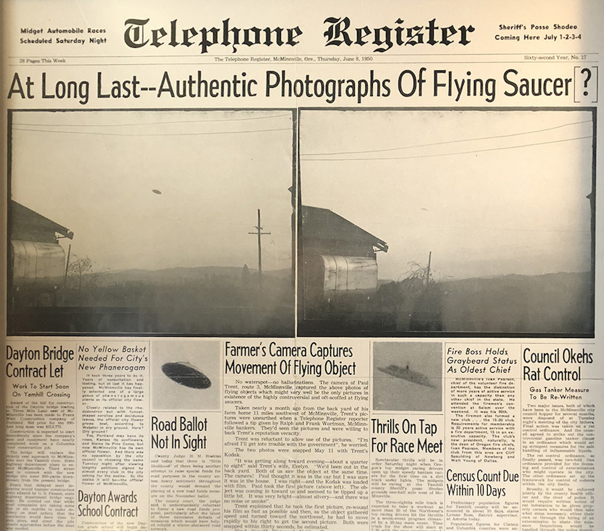 On May 11, 1950 Evelyn Trent had just finished feeding her rabbits at the manner's hutch, when she saw a slow moving UFO. Evelyn yelled for husband (PAUL TRENT), who was inside their farmhouse. She made it known that something odd was in the NorEast sky, the object was headed toward the Trent farm, which is roughly 9 miles from McMinnville, Oregon.